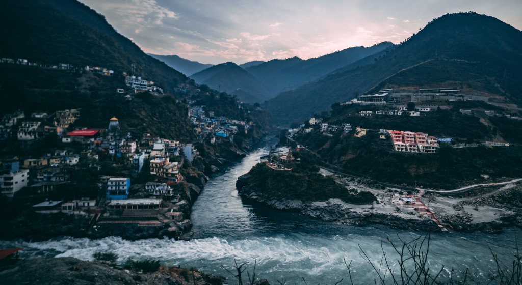 Confluence of the Bhagirathi and Alaknanda Rivers to produce the Ganges at Devprayag, India