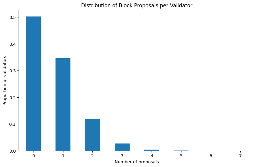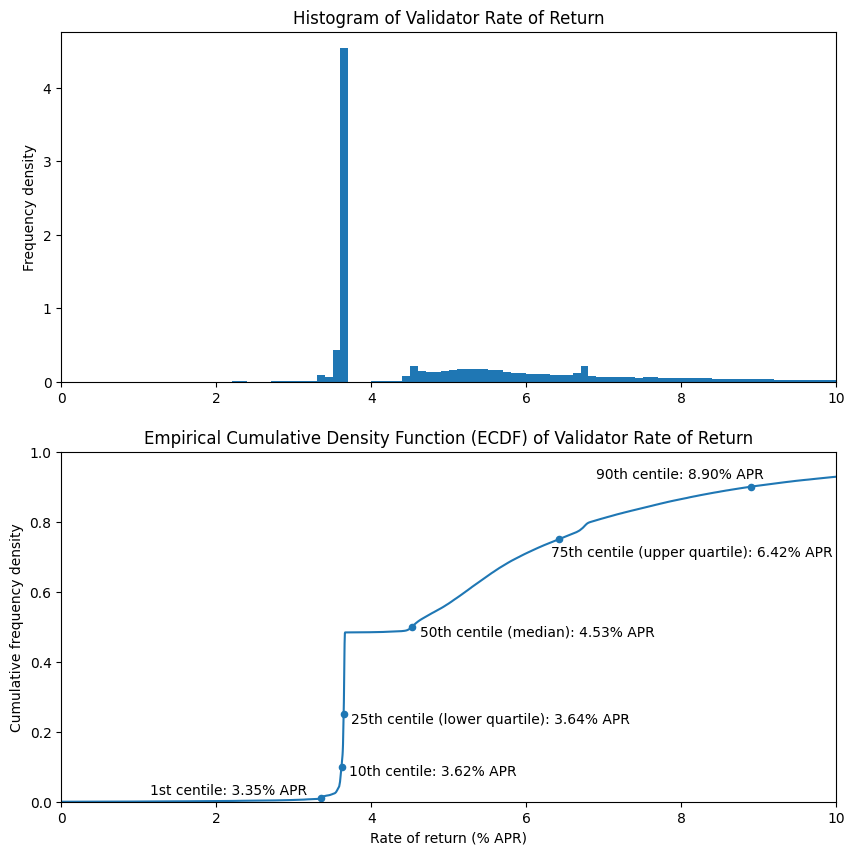 - Rates of return for individual validators at that this stage are extremely variable. This is because rewards are “lumpy”, and have become more so with the inclusion of execution layer rewards for validators. Around 50% of all validators have yet to propose any blocks, resulting in an APR below 4% for those validators in the meantime.
