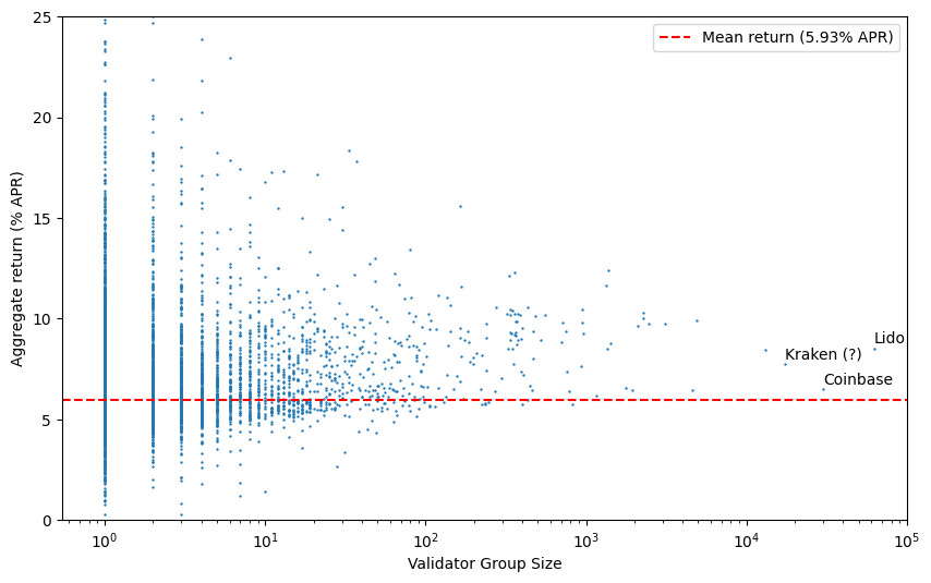In the above scatter plot, each validator group is identified by the number of observed validators which are part of the group (x-axis). However, since these groupings are based on observing proposed blocks, the more than 215k validators who have yet to propose any blocks all appear as a single point — if plotted, this would be off to the right of the chart (with an average rate of return of 3.8% APR). These ‘missing’ validators also explain why the overall mean rate of return (dashed red line) appears to sit below most of the plotted points. Note that many of these validators in fact are operated by the large node operators (e.g. Lido, Coinbase, Kraken), but are not counted as part of their grouping until they become visible in the data by proposing blocks, which means the APRs for these entities are currently over-reported by this analysis.