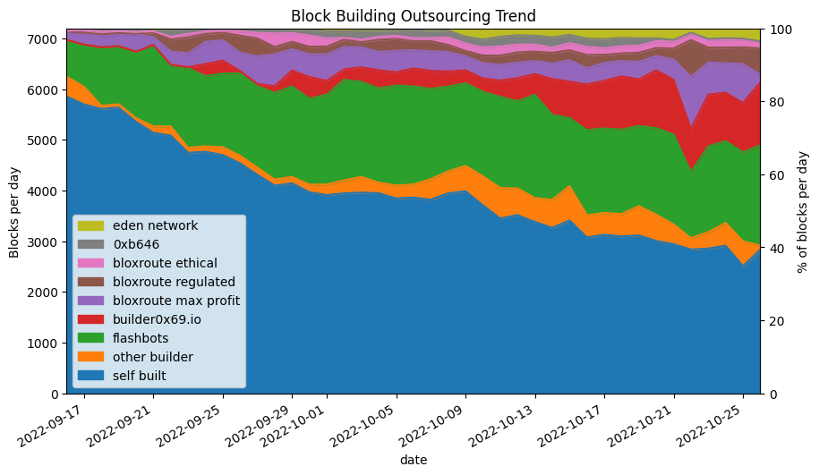 - During the analysis period, third party block builders took over the majority of block building from validators.