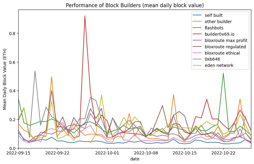 ax.set_title('Performance of Block Builders (mean daily block value)')