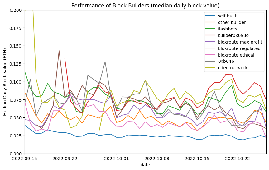 ax.set_title('Performance of Block Builders (median daily block value)')