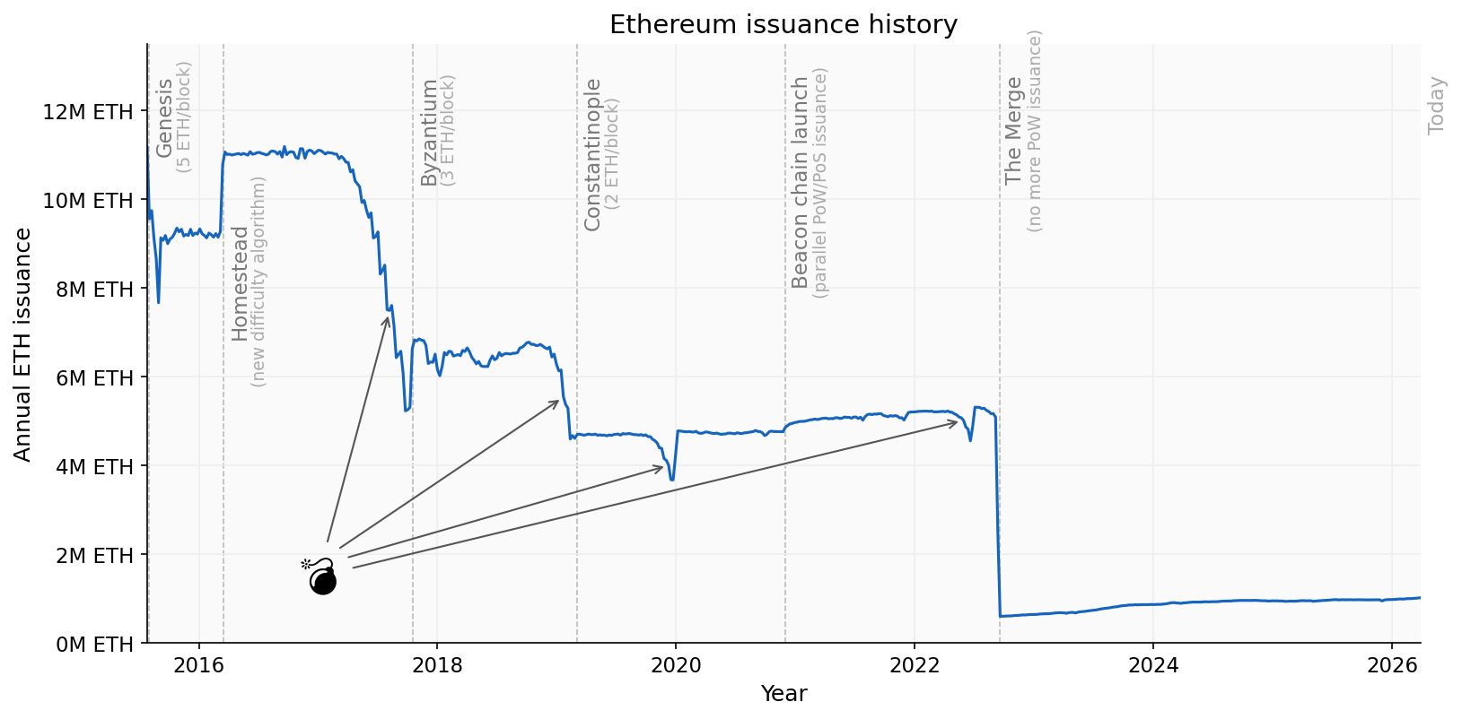 For reasons mostly to do with the difficulty adjustment rule, and particularly the so-called “difficulty bomb” (💣), the picture is fairly noisy. But the overall trend has been periodic reductions in issuance, up until the Merge. At launch in 2015, the base issuance was 5 ETH per block. This was reduced to 3 ETH per block in the Byzantium hard fork in 2017, and then to 2 ETH per block in the Constantinople hard fork in 2019. There was a slight increase in issuance due to the beacon chain launch in 2020, but then a large cut due to proof of work coming to an end in the Merge in September 2022.